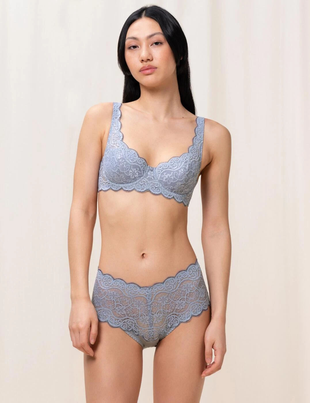 Flatter and showcase your cleavage in this gorgeous padded half cup bra by Triumph. This bra is a part of the Amourette 300 range, which introduces feminine pieces covered in elegant stretch lace. It features padded half cups, a lightweight 3D shaper underwire, adjustable straps and a hook and eye closure. Finished off with a mini bow in the centre. Matching items available to create a fully coordinated look.